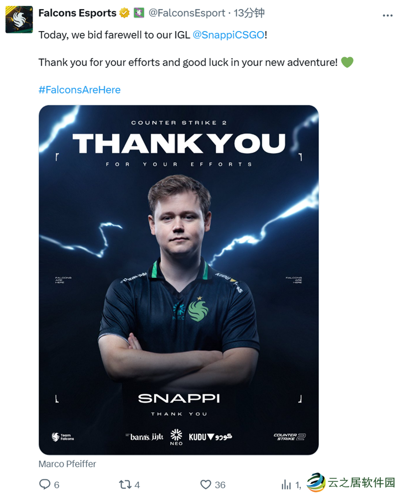 Falcons战队在社交平台上发布公告,与队伍指挥Snappi依依惜别。
