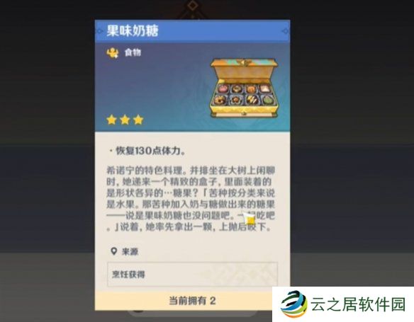 4、果味奶糖作为一种三星级的食谱,其效果是食用后能为玩家恢复130点的体力值。